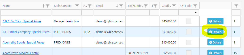 The Customer screen lists the key information about your Customers and provides a Details button which displays the full details of a single customer, as explained in this article.